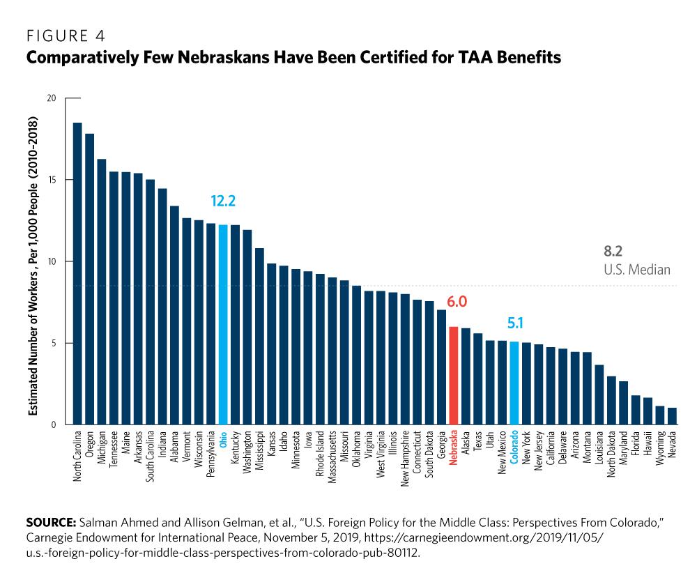 All too often, this debate takes place within relatively small circles within Washington, DC, without the benefit of input from state and local officials, small business owners, community leaders, local labor representatives, and others on the front lines of addressing the challenges facing middle-class households. That is why the Carnegie Endowment for International Peace convened a bipartisan task force in late 2017 to lift up such voices and inject them into the ongoing debate. The task force partnered with university researchers to study the perceived and measurable economic effects of U.S. foreign policy on three politically and economically different states in the nation’s heartland—Colorado, Nebraska, and Ohio. The first two reports on Ohio and Colorado were published in December 2018 and November 2019, respectively. This third report on Nebraska has been prepared in partnership with a team of researchers at the University of Nebraska–Lincoln (UNL).
