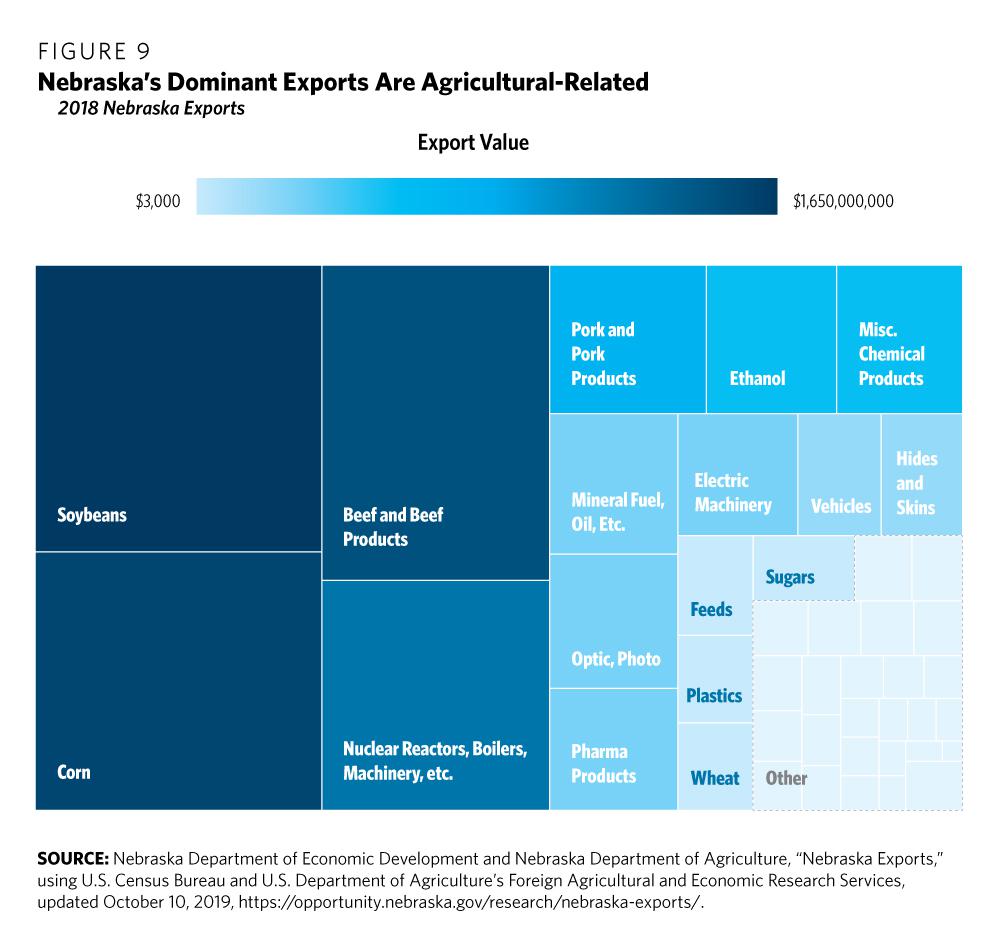 11 Nebraska Department of Economic Development and Nebraska Department of Agriculture, “Nebraska Exports,” using U.S. Census Bureau and U.S. Department of Agriculture’s Foreign Agricultural and Economic Research Services, updated October 10, 2019, https://opportunity.nebraska.gov/research/nebraska-exports/.