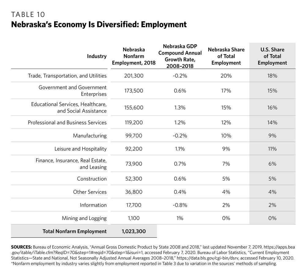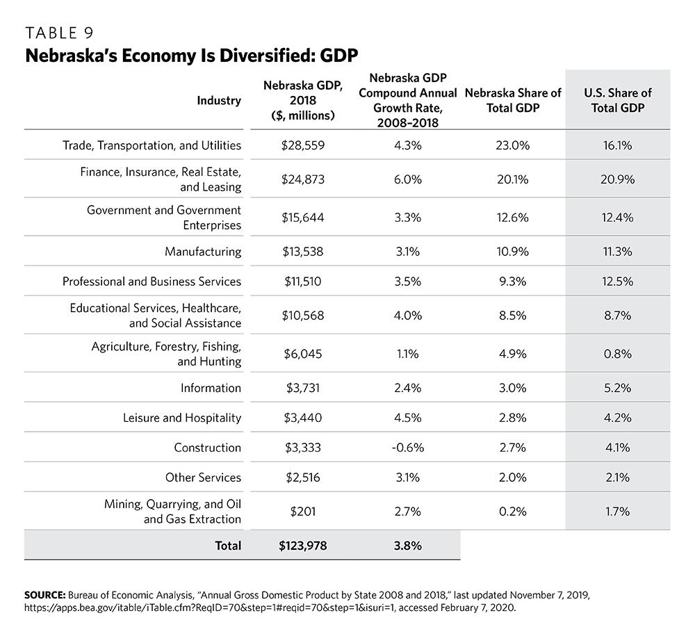 7 Nebraska Department of Economic Development, “Nebraska’s Opportunity Economy,” June 2018, https://opportunity.nebraska.gov/files/research/bchmrk07.pdf; and Nebraska Department of Economic Development, “Recent Trends in Selected Nebraska Economic Numbers,” January 3, 2020, https://opportunity.nebraska.gov/files/research/trends/trends.pdf.