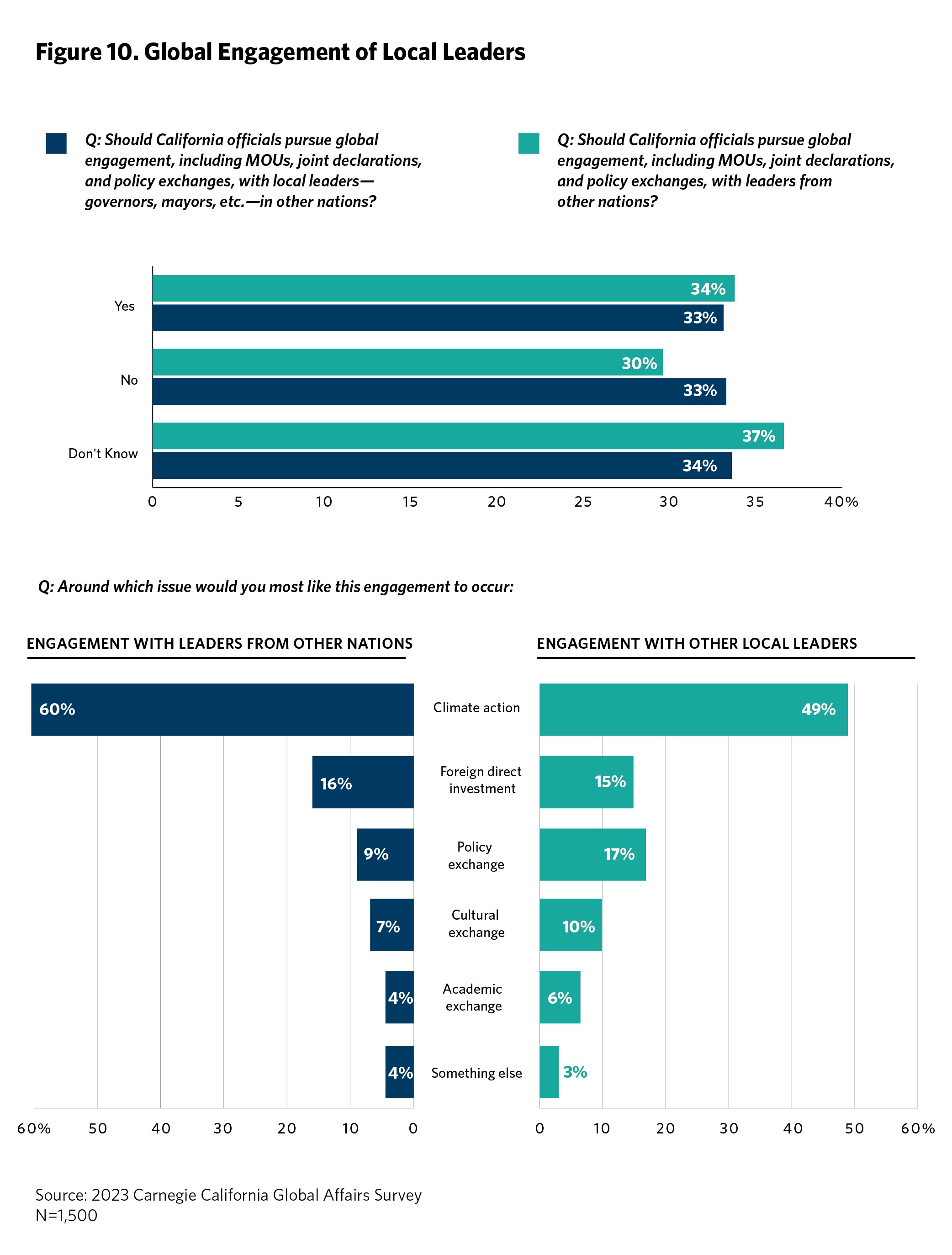 The state of California and its cities and communities have a long history of diplomatic engagement with the wider world. For example, the state’s memorandum of understanding (MOU) on joint climate action and low carbon development with China’s National Development and Reform Commission, signed in 2013, preceded the breakthrough bilateral agreement on climate between the United States and China in 2015.18 More recently, and tracking closely to diplomatic advances between the United States and Australia, California signed a 2023 MOU with Australia to forge a new climate partnership centered around climate change, critical minerals, and clean energy.19 Californian cities and metropolitan areas have long been, and remain, in the lead on such efforts. The Port of Los Angeles has entered into agreements with Shanghai, Tokyo, Singapore, and a number of other Asian port cities to jointly develop green shipping corridors. This section explores how Californians feel about their state and local leaders engaging in transnational diplomatic efforts and the issues around which they think such engagement is worthwhile.