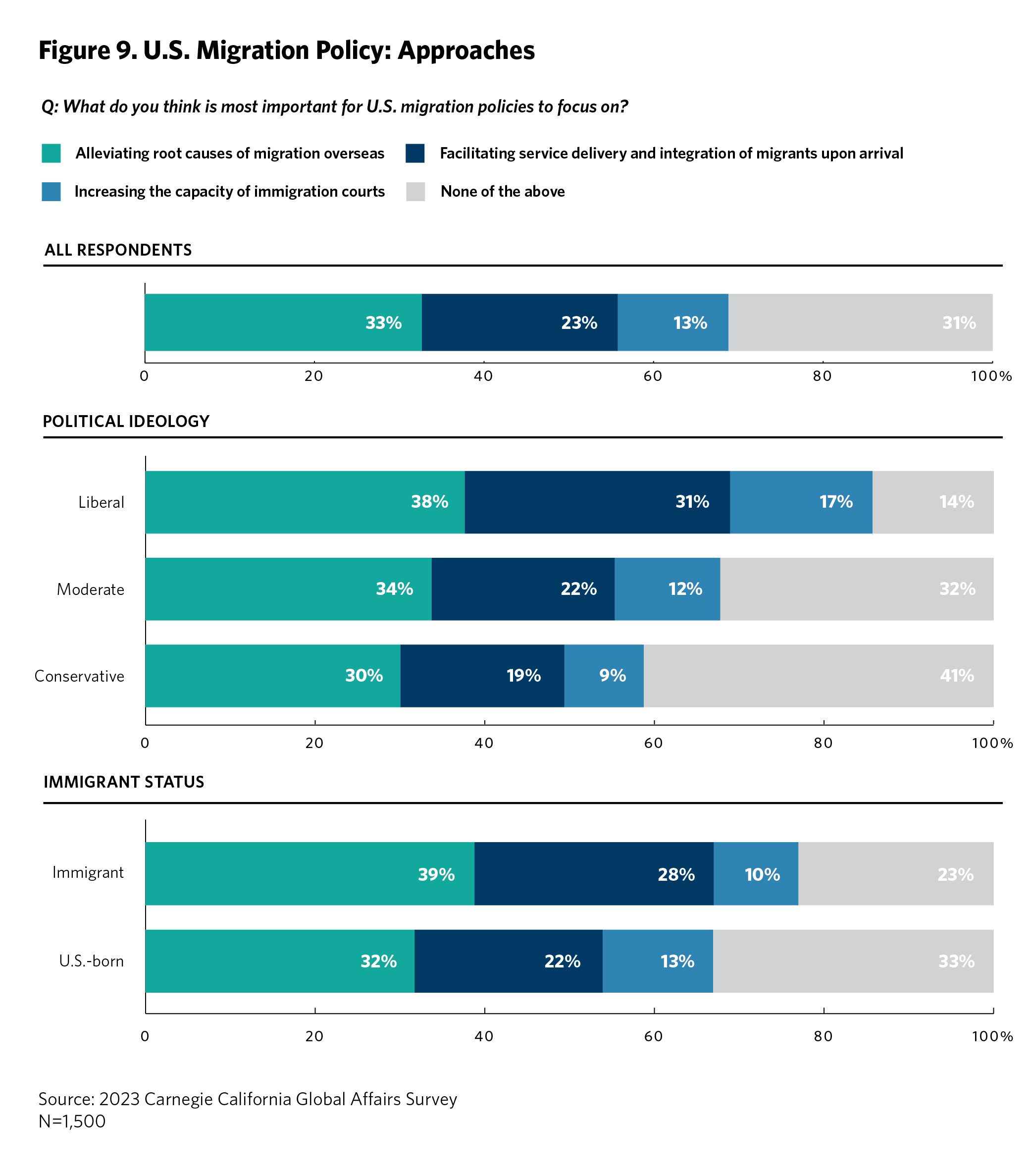 Thirty-three percent of respondents believe that U.S. immigration policy should focus most of its attention on alleviating the root causes of migration overseas. As captured in figure 9, however, the route forward on immigration policy is by no means clear to many. A similar 31 percent of respondents believed none of the following options are most important for U.S. immigration policy: alleviating root causes, facilitating service delivery and integration of migrants upon arrival, or increasing the capacity of immigration courts. Future surveys will explore this question in more depth. Respondents who are above age thirty, male, Asian American, college-educated, from the lowest-earning and highest-earning income brackets, city-located, or nonvoters believe alleviating root causes to be the most important for U.S. immigration policy, while all other demographics believe that none of the options provided is the most pressing need for U.S. immigration policy.